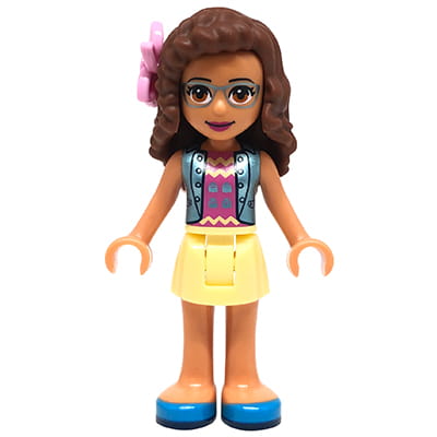 LEGO Friends Mini doll - Olivia - bright light yellow skirt, dark pink top with blue shiny jacket, reddish brown hair with flower, glasses. Brand new mini figure, comes from an original LEGO set. Minifig is packed in a zip-lock bag (Please note the product does not include official LEGO packaging).