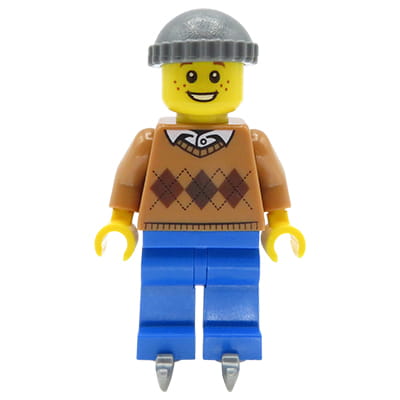 LEGO City Minifigure - Boy / Teenager in medium nougat sweater, dark bluish gray knitted cap and skates. It has blue legs, open smile and freckles. New mini figure, comes from an original LEGO set. Minifig is packed in a zip-lock bag (Please note the product does not include official LEGO packaging).