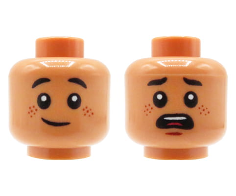 LEGO minifig head - child / boy, nougat, freckles, dual sided (smile / scared). Head new, comes from an original LEGO set.