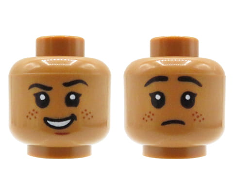 LEGO minifig head - child / girl, medium nougat, freckles, dual sided (open smile / sad). Head new, comes from an original LEGO set.