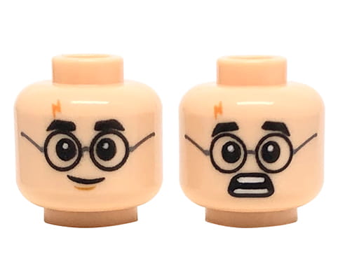 LEGO minifig head - man, light nougat, black round glasses, dual sided (smile / scared). Head new, comes from an original LEGO set.