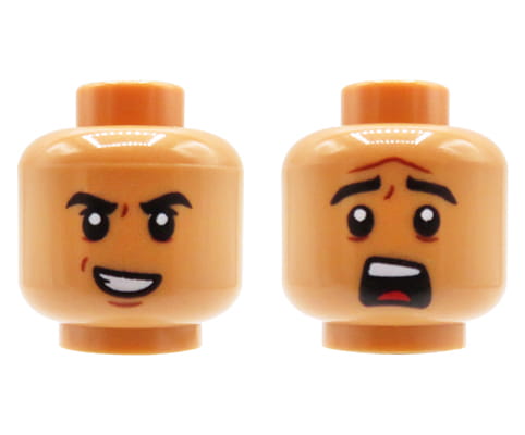 LEGO minifig head - male, nougat, dual sided (smile / scared). Head new, comes from an original LEGO set.