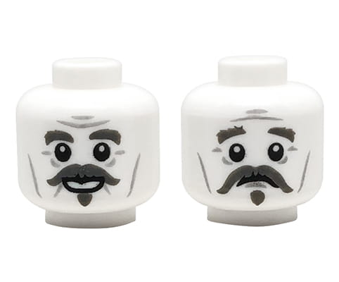 LEGO minifig head - man, white, gray eyebrows and moustache, dual sided (smile / worried). Head new, comes from an original LEGO set.